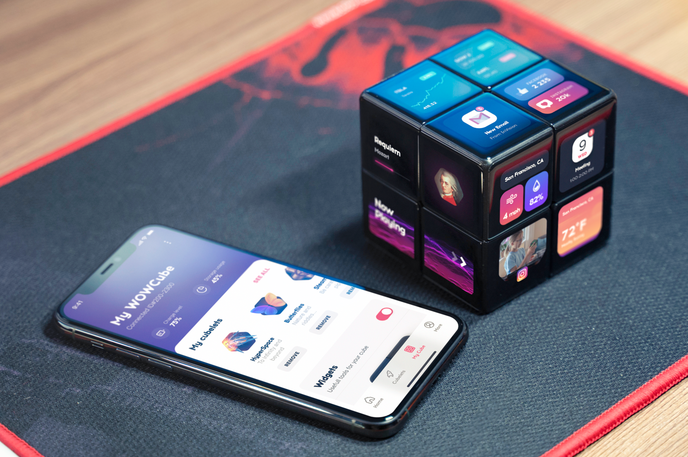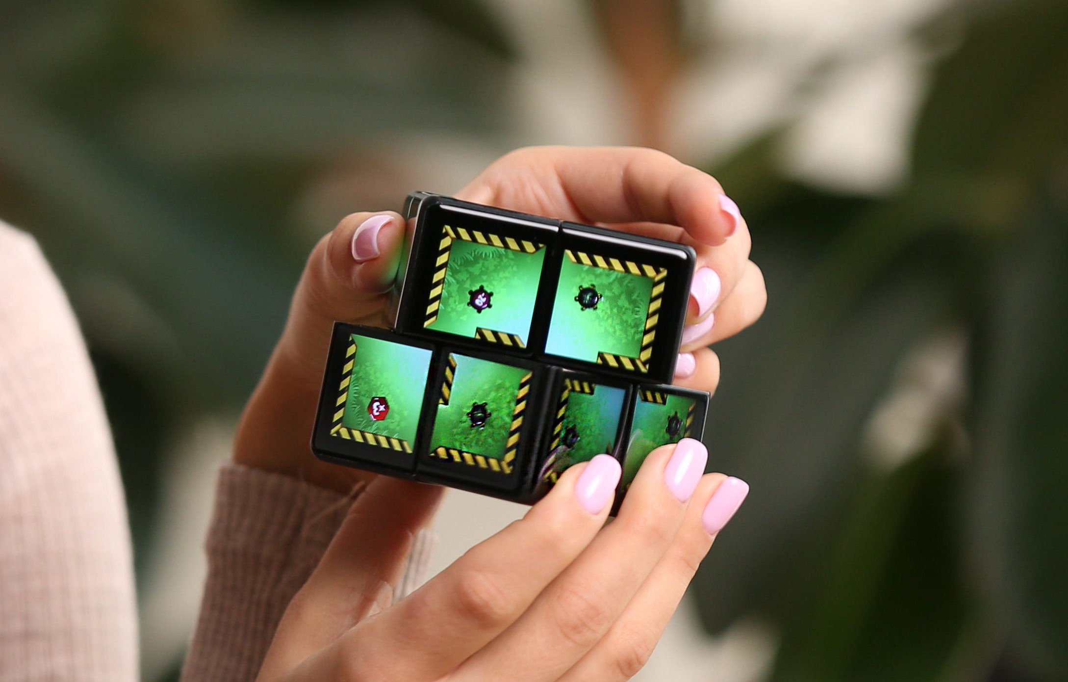The WOWCube is a handheld entertainment device made of eight interconnected modules, forming a cube with 24 screens across all six sides. Games and applications run seamlessly around the entire object, creating a fully spatial display. Unlike traditional consoles, the WOWCube is designed to be physically manipulated. Players interact by rotating, tilting, and twisting the device in their hands. This enables unique game concepts built around orientation, perspective, and tangible interaction.