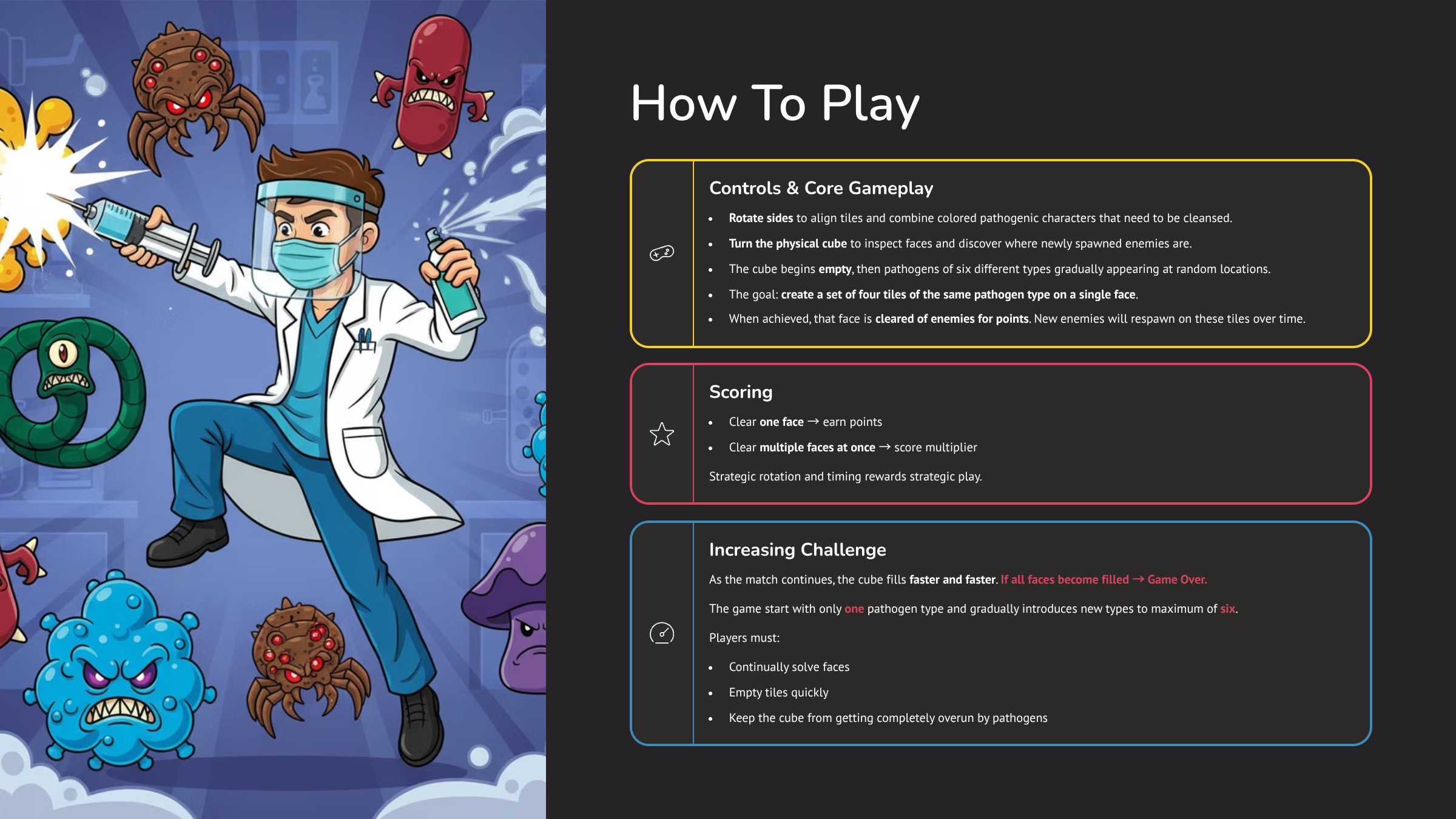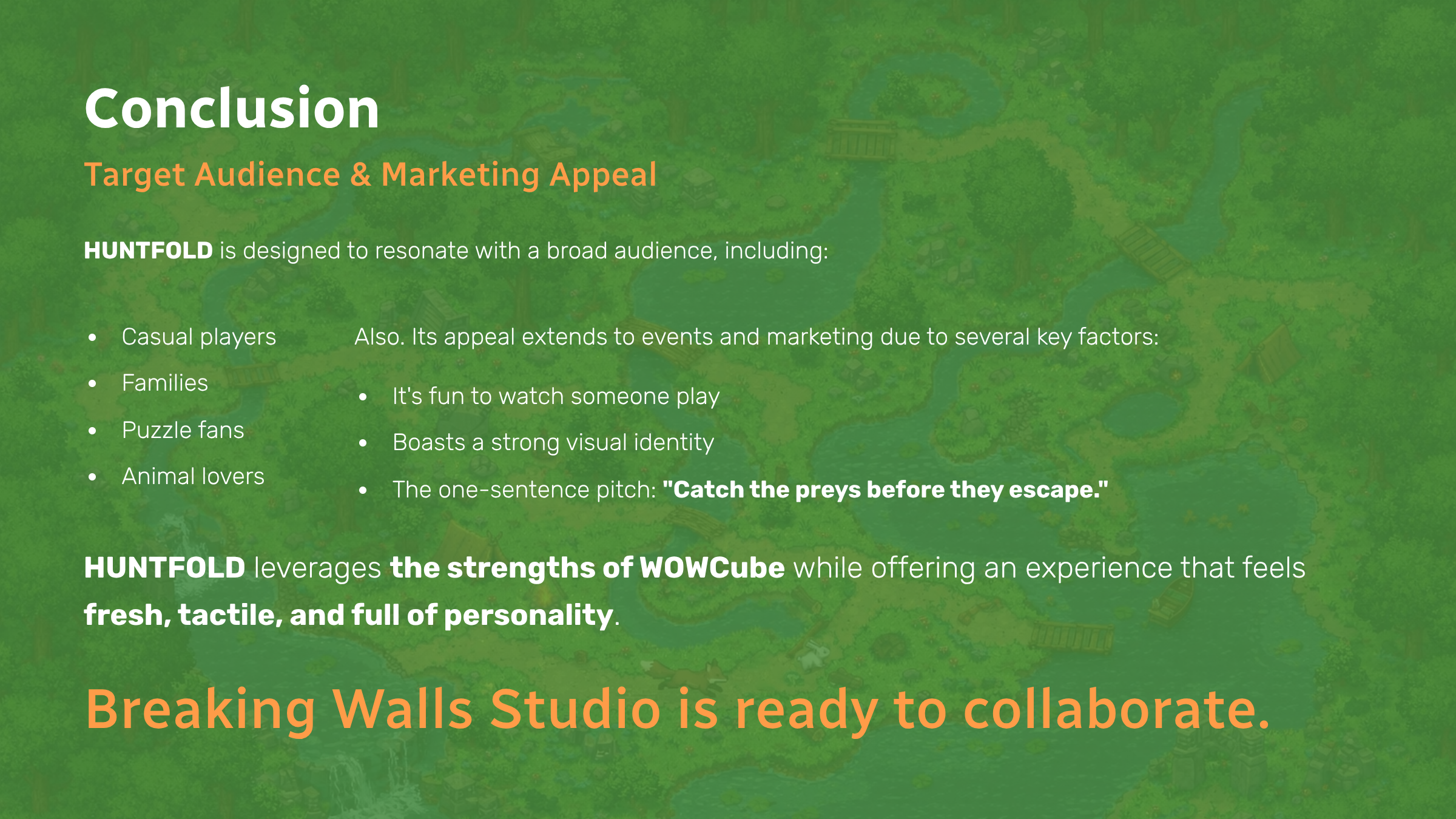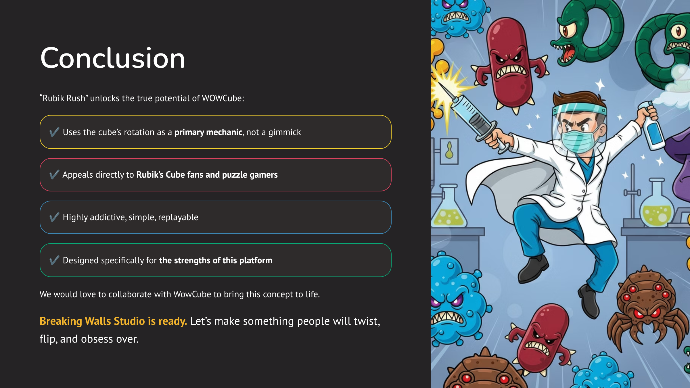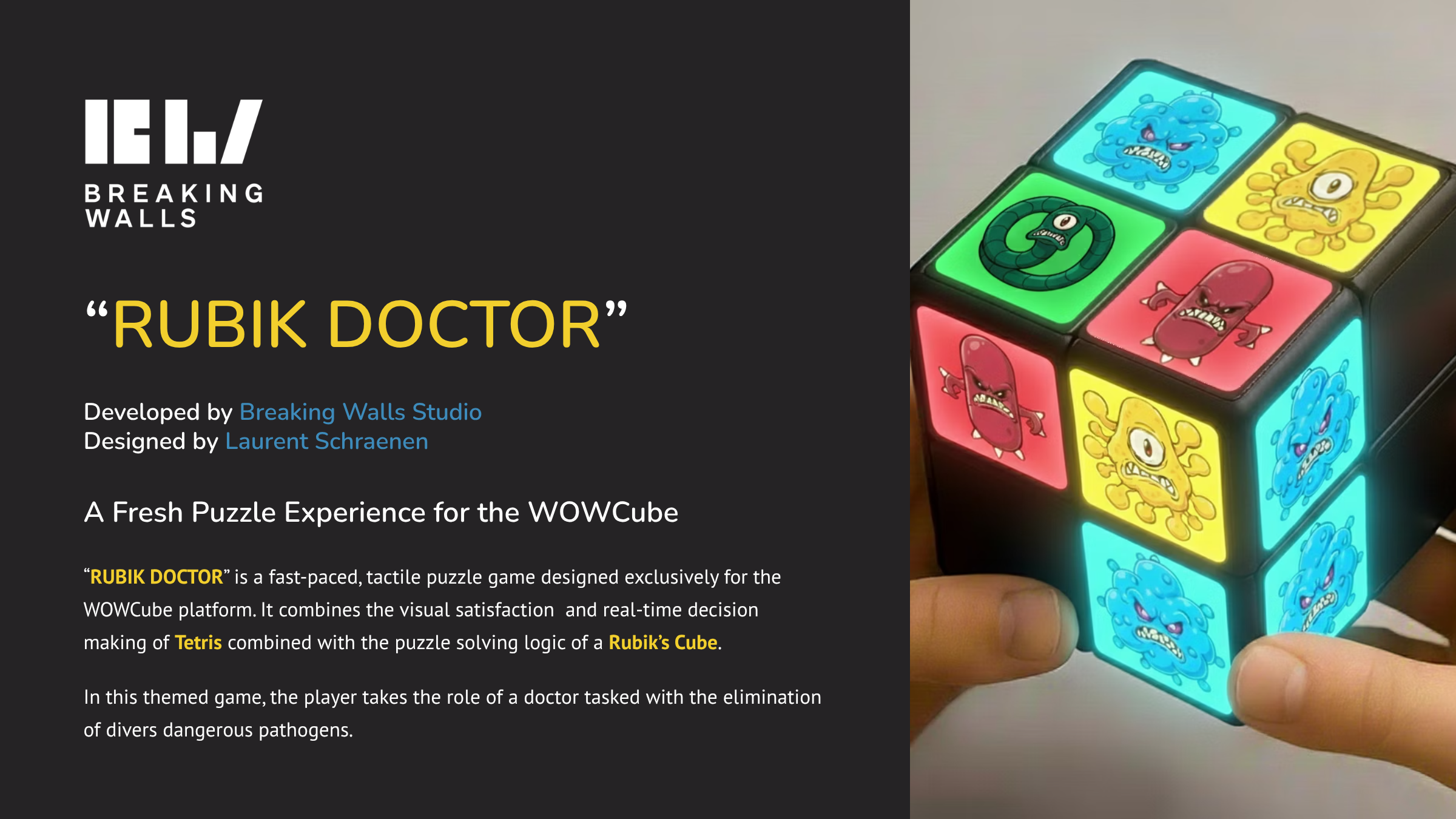 On behalf of Breaking Walls Studio, I was tasked with conceptualizing, designing, and presenting game ideas for a new interactive gaming device called the WOWCube.